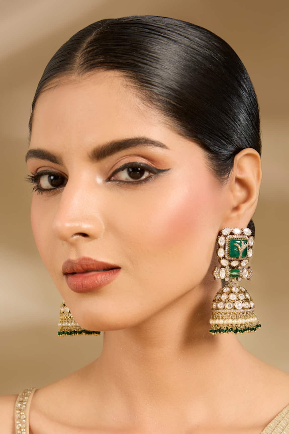 Gold Plated Jhumkas with Moissanite & Emerald