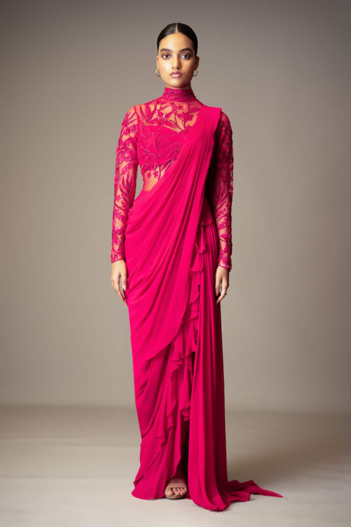Draped Saree Gown With Embroidered Tulle Cape