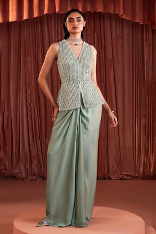 Divine Scallop Pearl Embellished Cape Draped Skirt Set