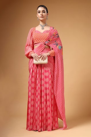 Amvya Print Pre-Draped Fish Cut Saree & Blouse Set