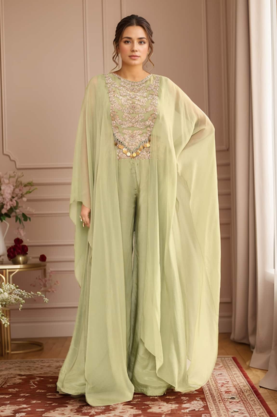 Floral Embroidered Cape Set With Palazzo