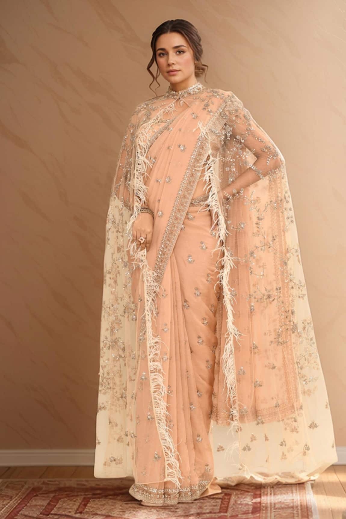 Rose Gold Floral Embroidered Saree & Cape Set