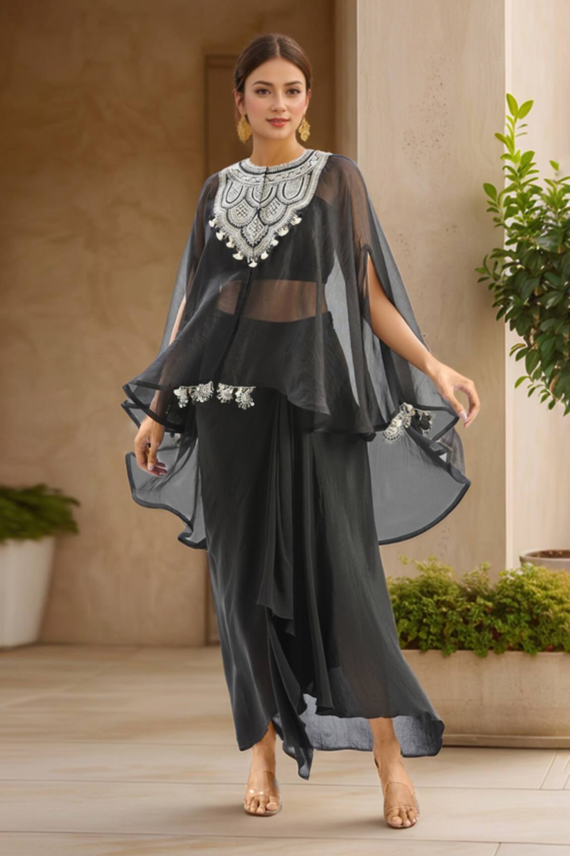Geometric Embroidered Cape & Draped Skirt Set