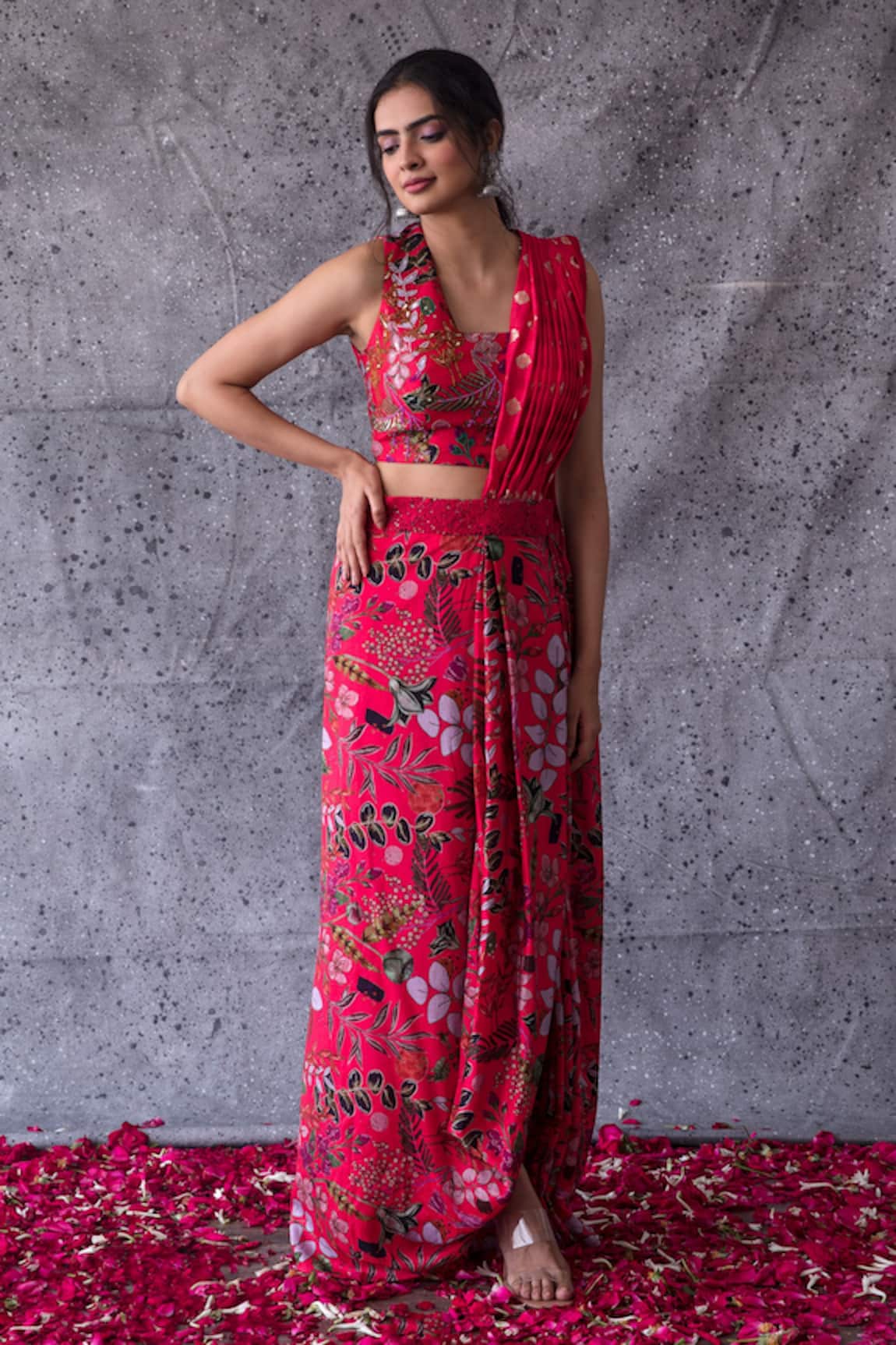Floral Print Draped Saree With Blouse