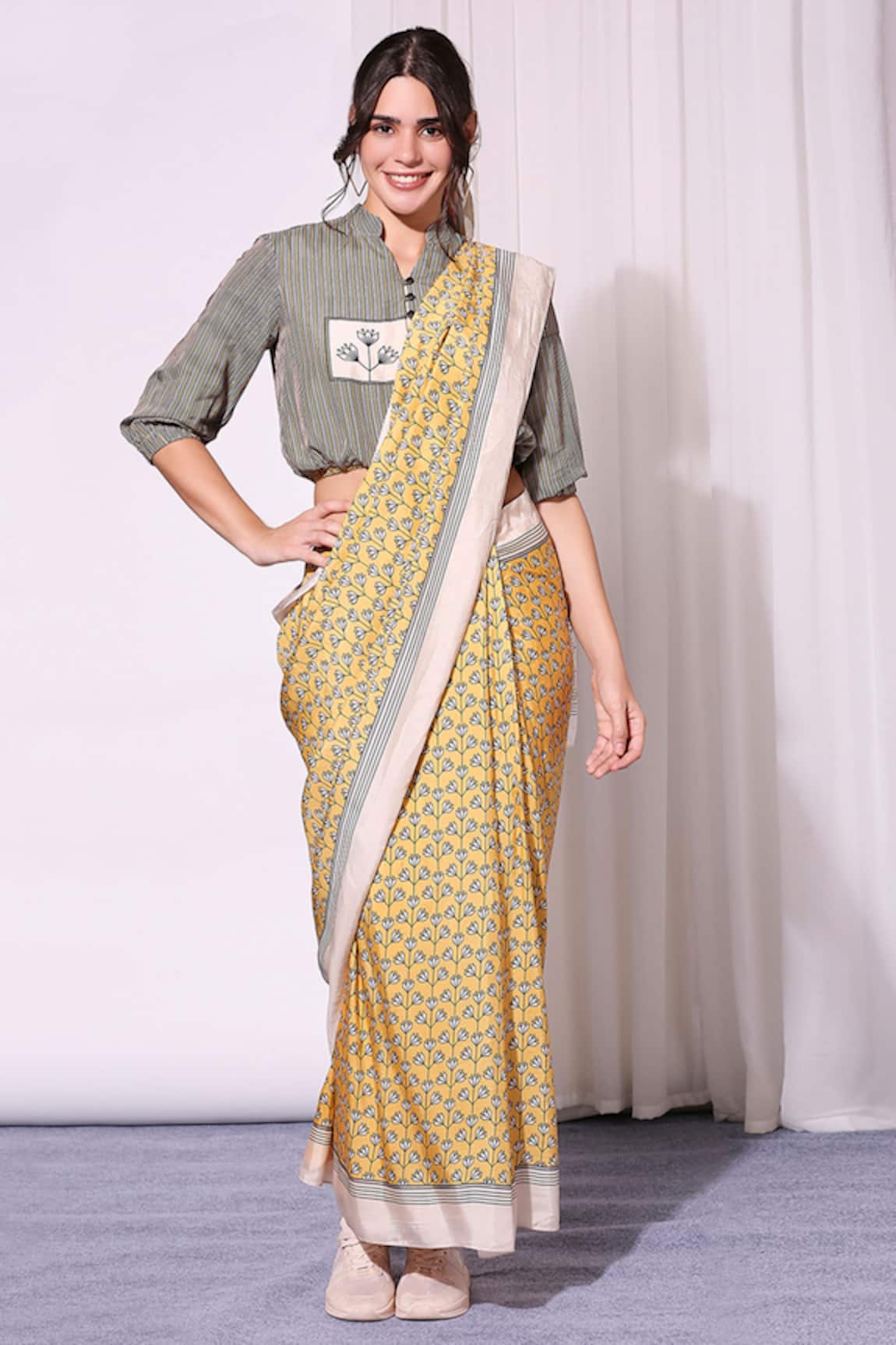 Printed Pre-Draped Saree With Blouse