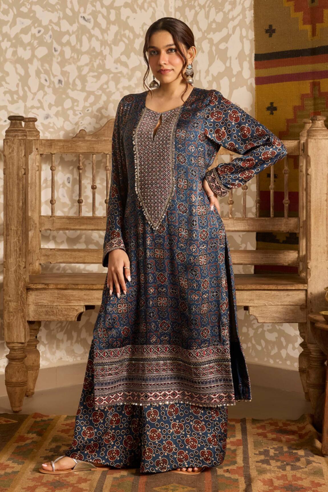 Ajrakh Print Embroidered Kaftan With Flared Pant