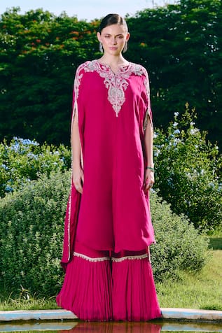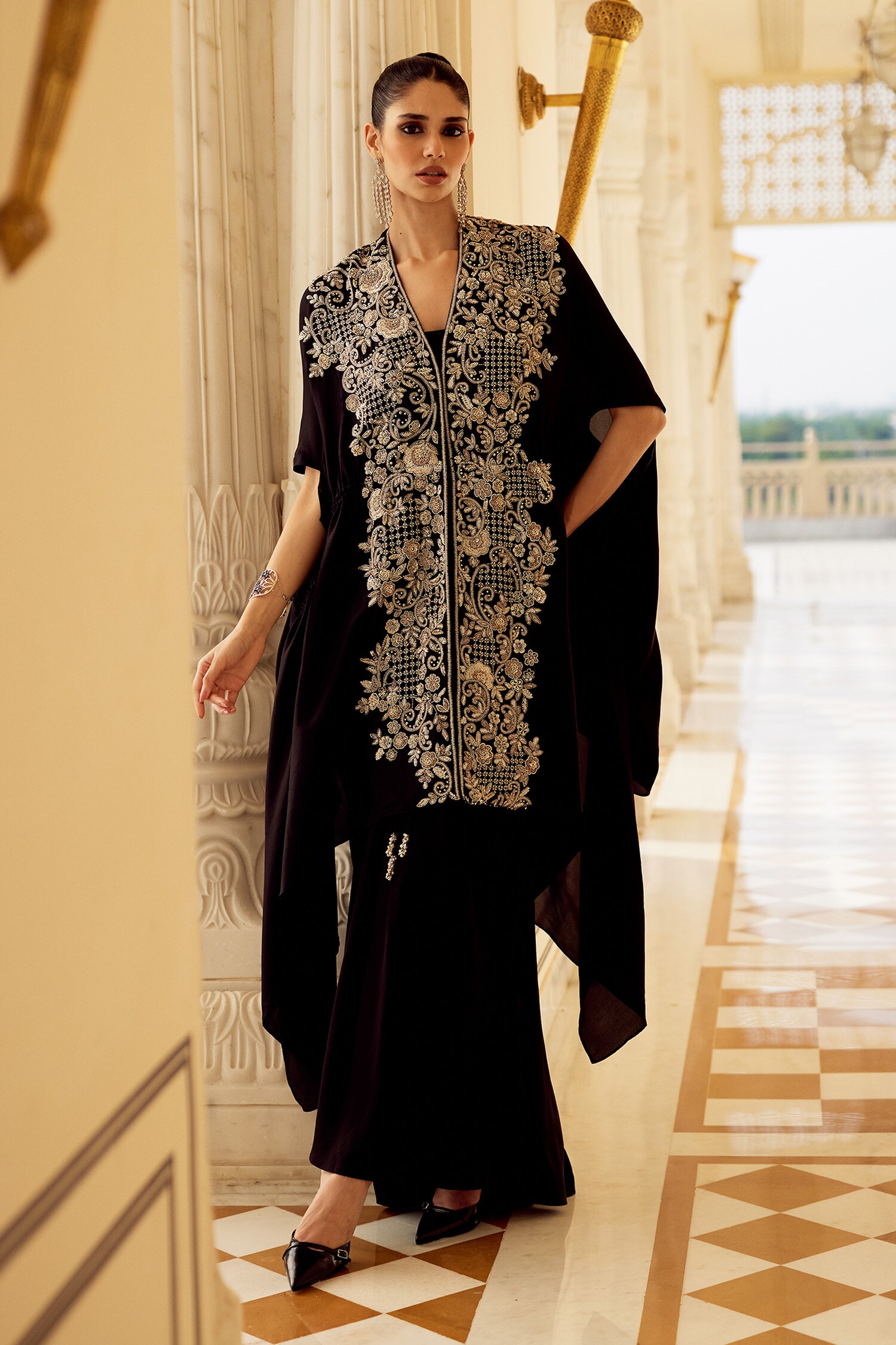 A fluid integration of Indian craftsmanship with Western sensibilities, unveiling timeless silhouettes with signature metallic embroidery shimmering on sumptuous fabrics with flair.
