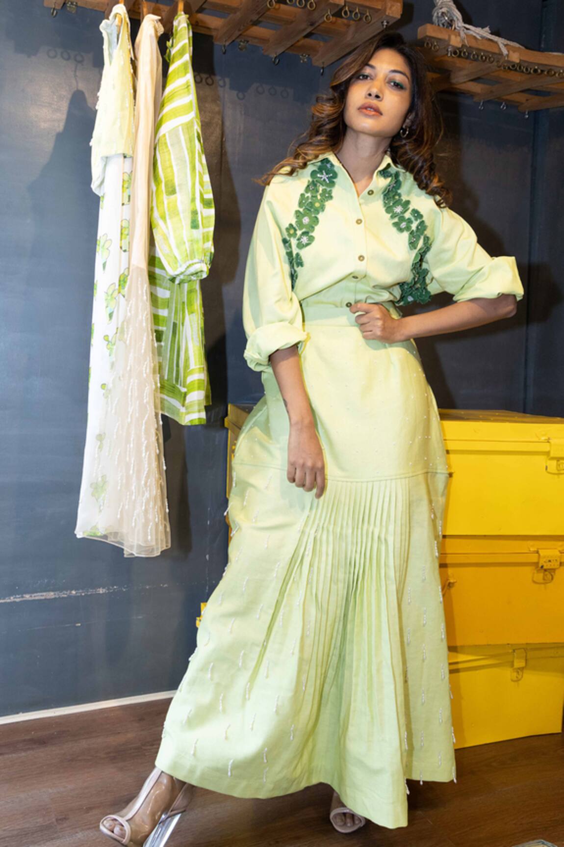 Embroidered Green Denim Shirt & A-Line Skirt Set