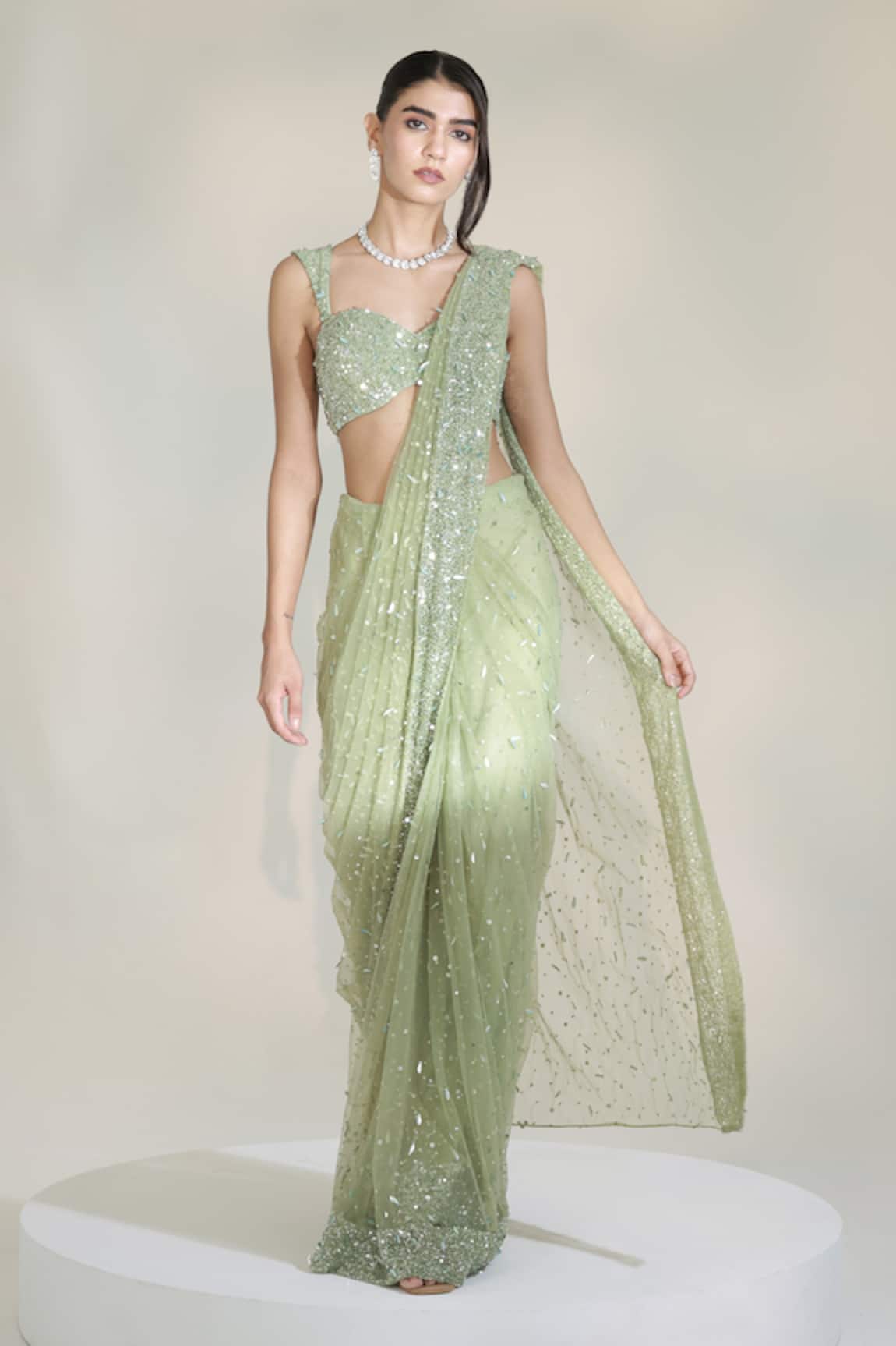 Sage Luxe Glam Pre-Draped Saree With Embroidered Blouse