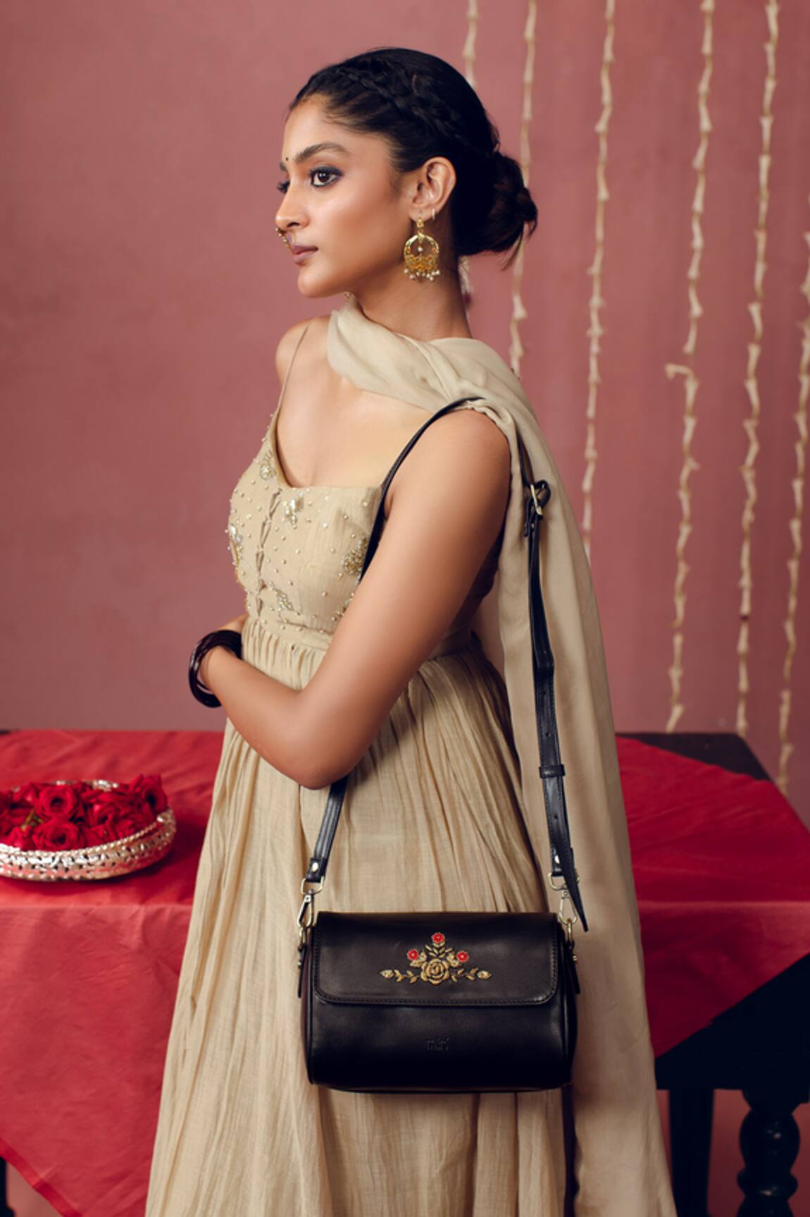 Hand Embroidered Golden Rose Sling Bag