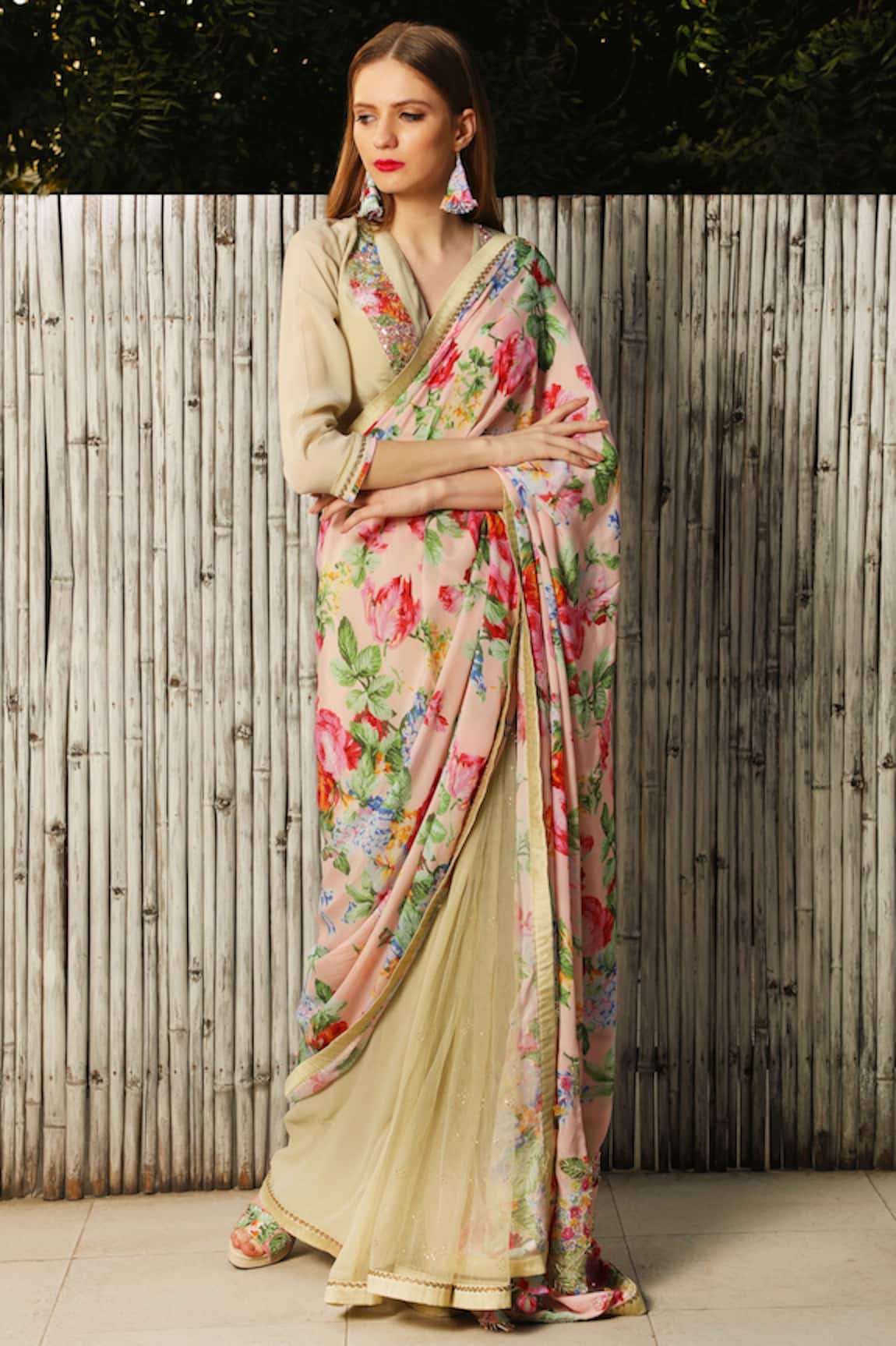 Floret Print Asymmetric Godet Kaftan Tunic With Dhoti Pant