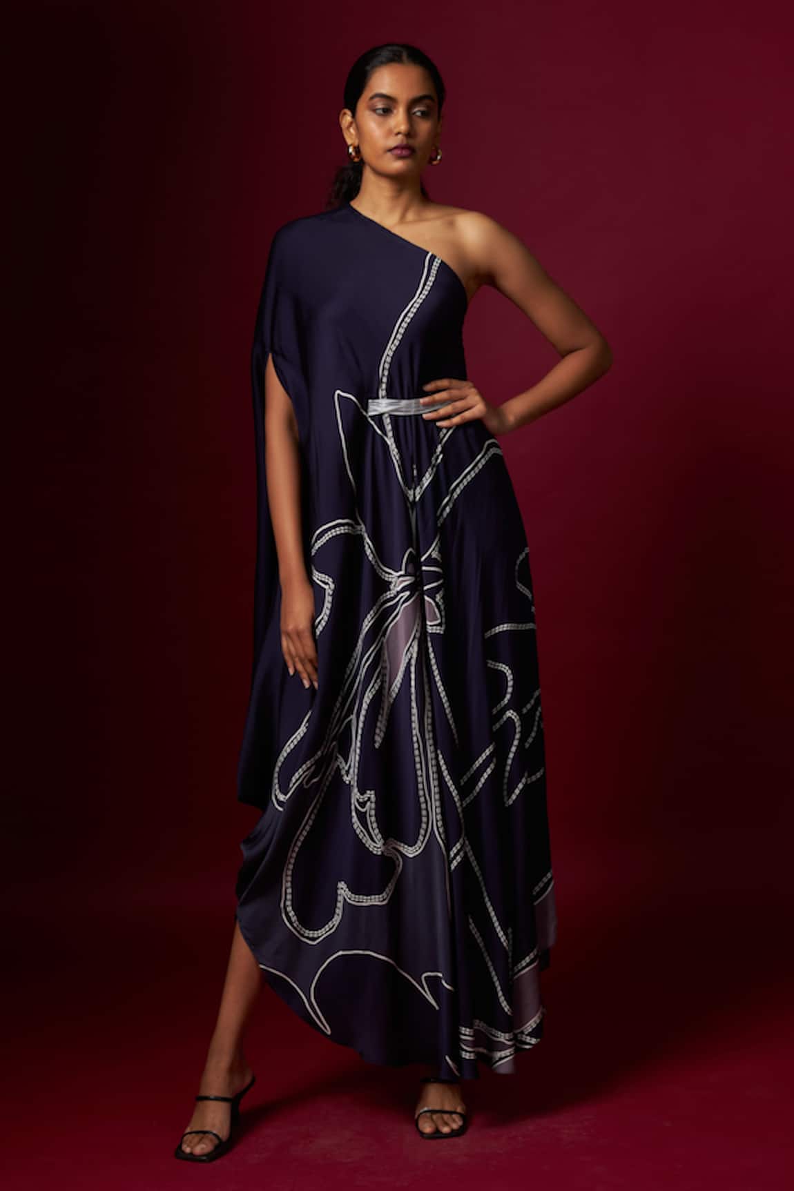 Abstract Print One Shoulder Draped Dress