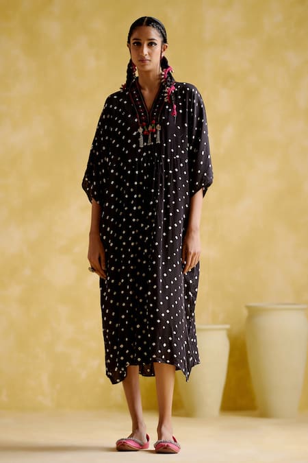 Black Modal, Satin V-neck Devadarsana Flared Sleeve Handcrafted Kaftan