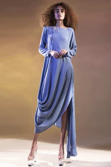 Blue Textured Crepe Bateau Draped Cowl Dress