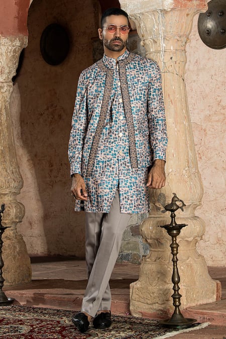 Blue Cotton, Polyester Embroidery Abstract Bundi Kurta Set