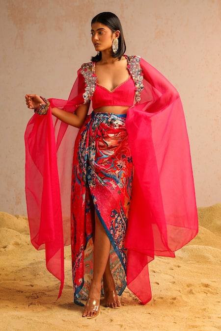 Pink Georgette Satin Printed Abstract Motifs Cape Open Embroidered Skirt Set