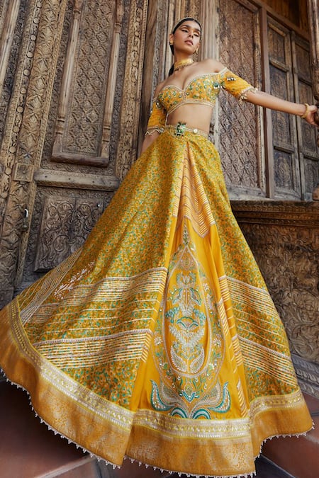 Yellow Blouse , Lehenga Jamawar Katan Bead Work, Print And Set