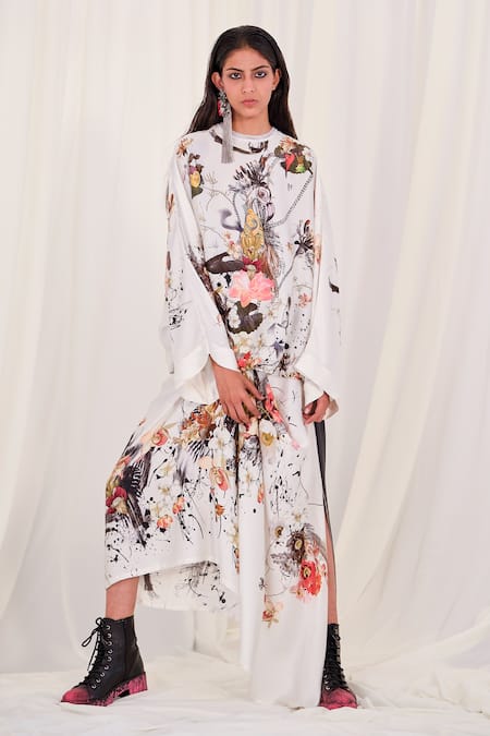 White Silk Embroidery Round Neck Flower And Ostrich Print Top With Skirt