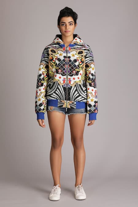 Multi Color Pure Cotton Civilised Tiger Print V Neck Hoodie