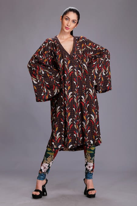Brown Cotton Silk Leaf V Neck Print Jacket