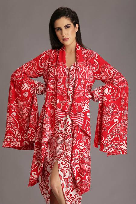 Red Rayon Cotton Ocean Shawl Collar Print Jacket