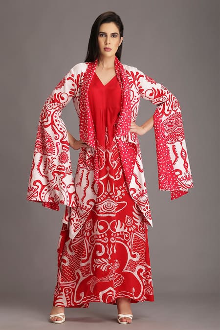 Red Rayon Cotton Ocean Shawl Collar Print Split Sleeve Jacket