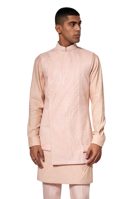 Peach Raw , Cotton Embroidered Bundi And Kurta Set