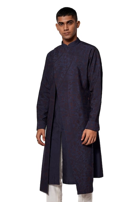 Blue Cotton Silk Embroidered Layered Kurta Set