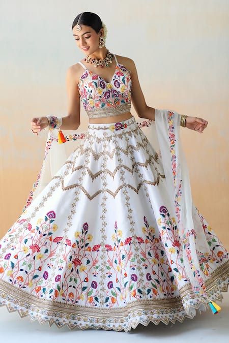 White Raw Silk, Organza Cutdana, Floral, Sequin V Embroidered Bridal Lehenga Set