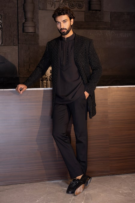 Black Polyester Beads Geometric Embroidered Jacket Kurta Set