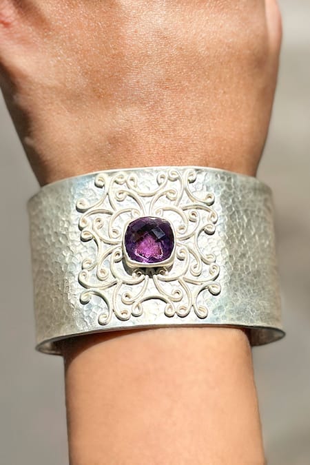 Silver Plated Stones Amethyst Carved Cuff Bracelet