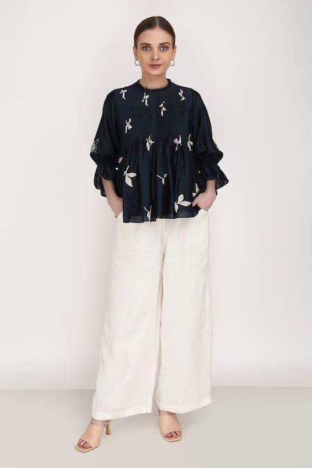 Blue Linen, Silk Chanderi Leaf Round Print Top And Pant Set