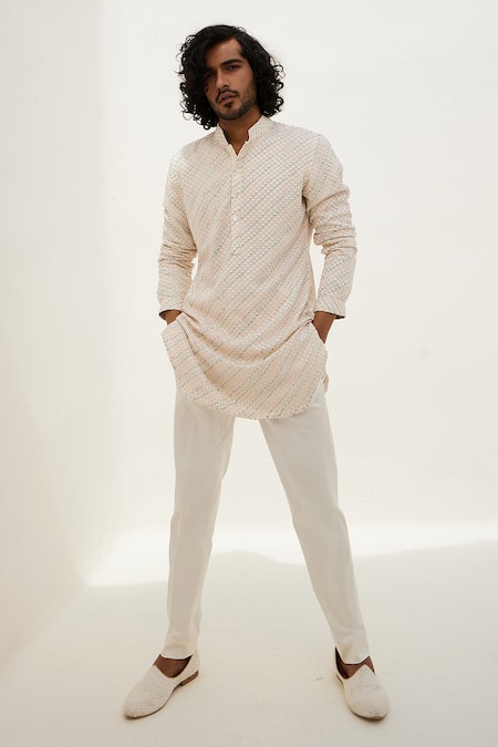 Ivory Cotton, Silk, Georgette, Lycra Embroidery Floral Kurta With Pant