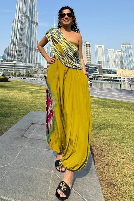 Green Crepe Square Neck Hand Dyed Textured Jumpsuit With Corded Throw