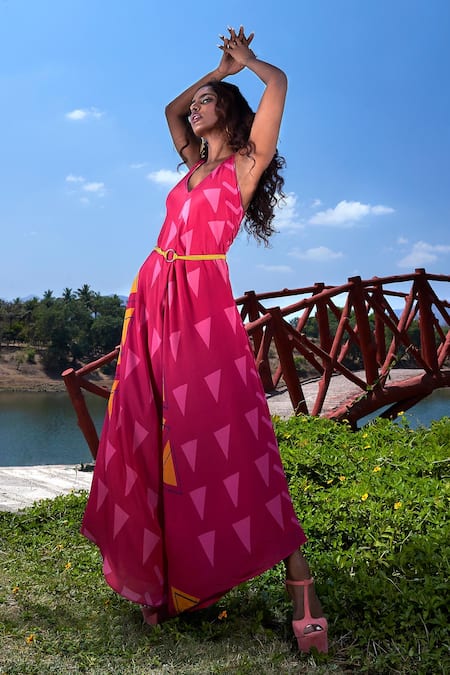Pink Crepe Beads V-neck Triangle Print Jumpsuit