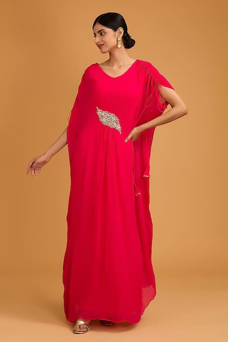 Red Georgette Sequins, Embroidery V-neck Thread Draped Kaftan