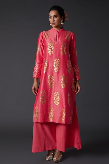 Pink Cotton, Chanderi Silk Floral Mandarin Collar Kurta And Palazzo Set