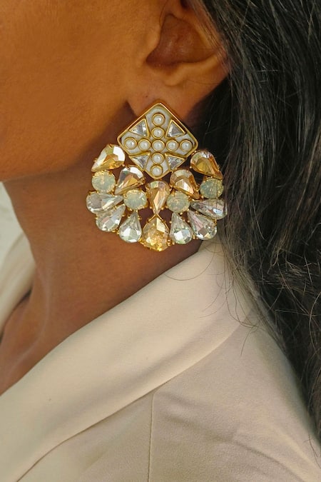 Gold Plated Pearls, Crystals, Stones Nivi Shell And Kundan Stud Earrings