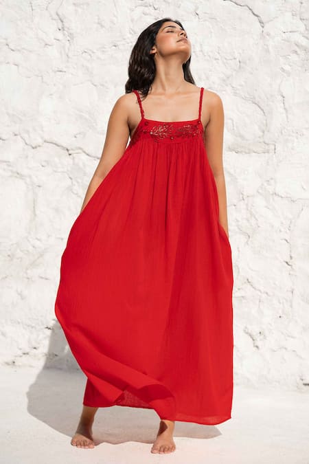 Buy_Beachbum_Red Cotton Embroidery Square Neck Scarlet Embellished Long Dress