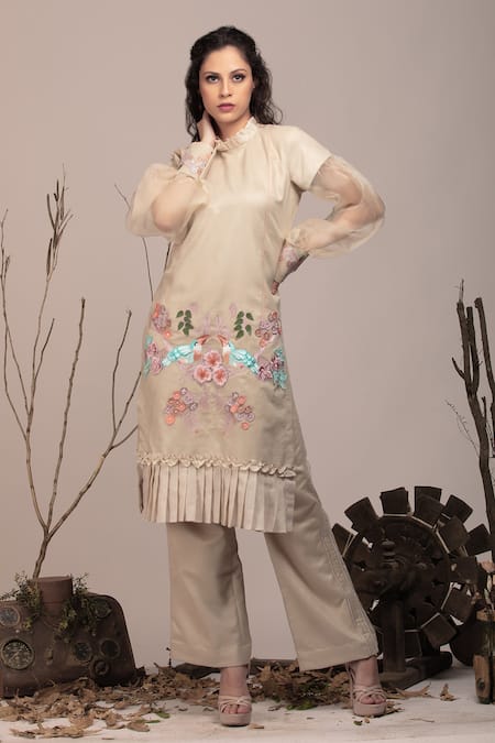 Beige Cotton, Suede Embroidery Round Neck Floral Applique Kurta And Pant Set