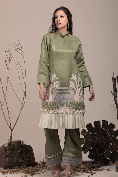 Green Cotton, Suede Embroidery Round Neck Floral Applique Kurta Set