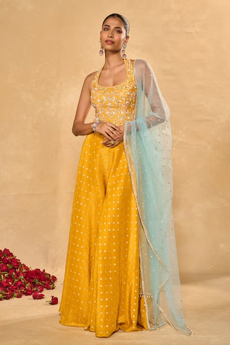 Yellow Silk, Net Beads, Pearls, Zari Riz Jamewar Woven Corset Flared Pant Set