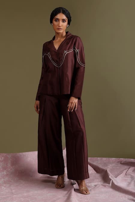 Brown Silk Embroidery Chakra Handwoven Jacket And Pant Set