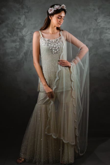 White Organza, Taiwan Net Round Embroidered Kurta Set