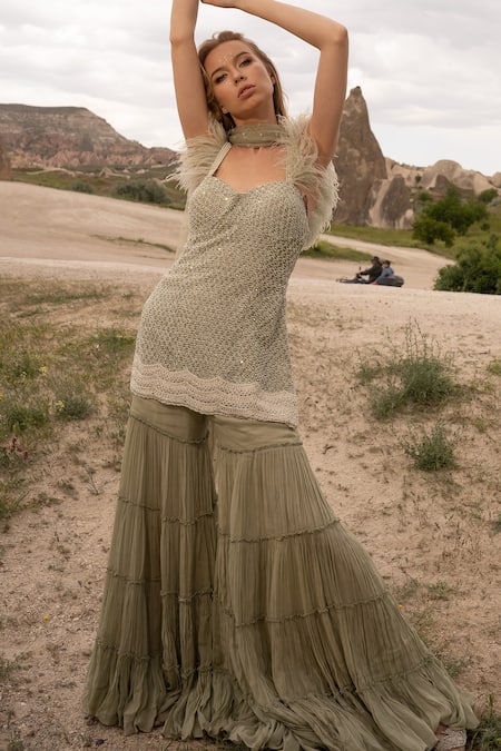 Green Organza, Viscose Sequins, Beads, Hand Embroidered Kurta Sharara Set