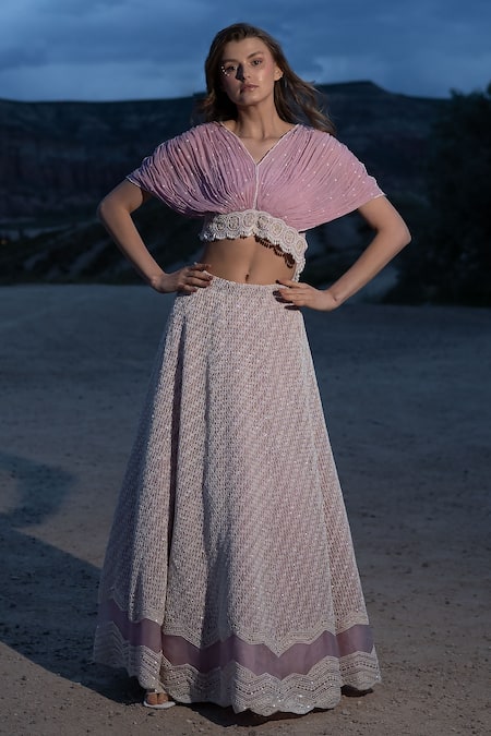 Purple Organza Sequins, Mirrors Hand Embroidered Lehenga With Cape Blouse