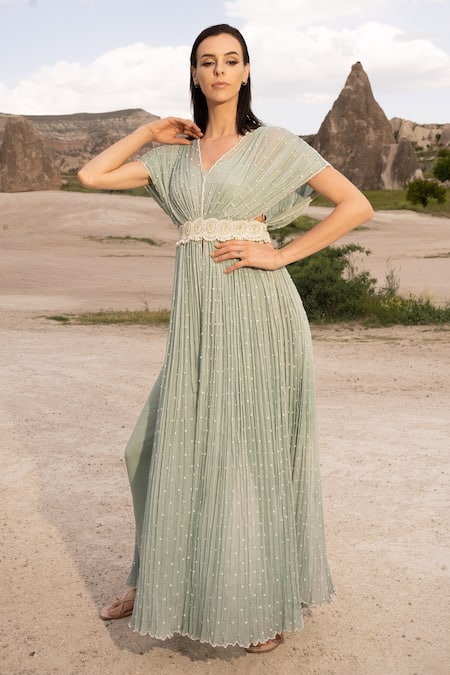 Green Chiffon Pearls V-neck Embroidered Cape Pant Set