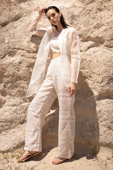 Ivory Organza Sequins, Beads Open Neck, Sheer Jacket And Hand Embroidered Pant Set