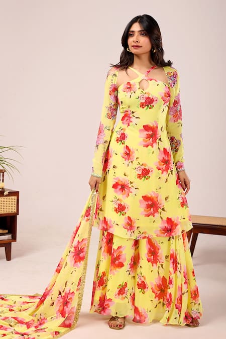 Yellow Viscose Georgette Embroidery, Zari Sunehri Phool Printed Sharara Set