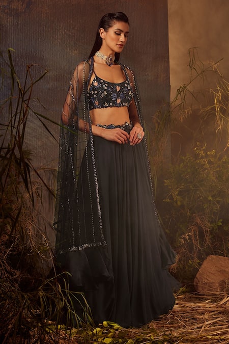 Blue Organza, Net, Crepe Bugle Beads And Zari Athena Embroidered Lehenga Set